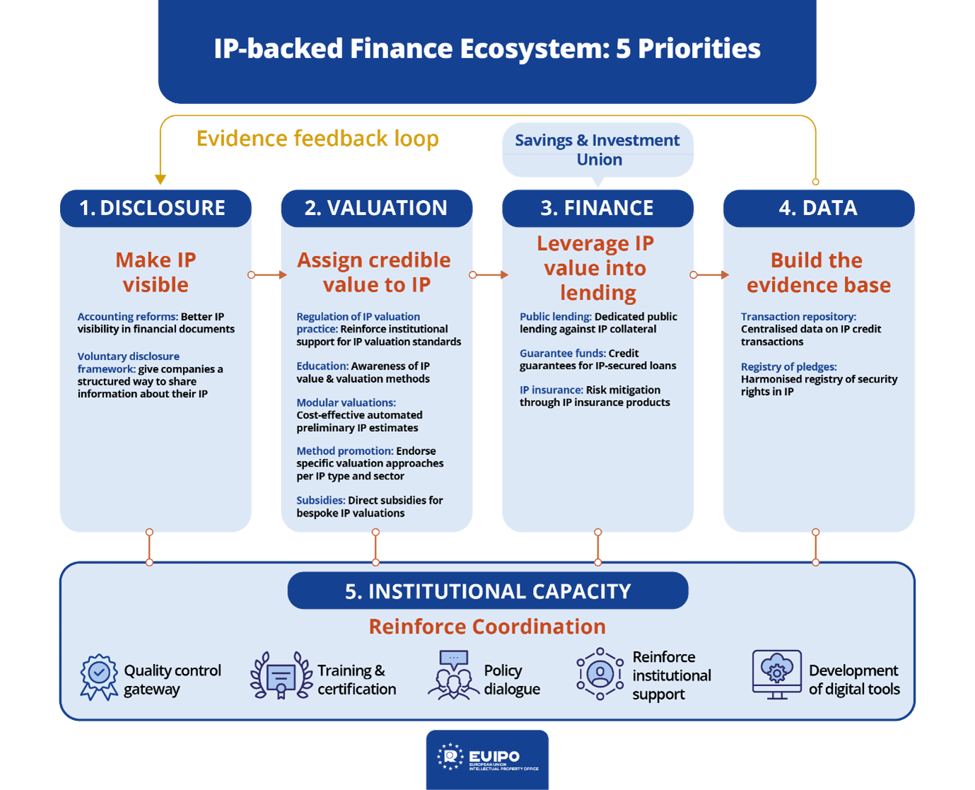 The report has then organised what it says are the “most actionable” steps into five sequenced priority areas, “aiming at laying the foundations for a functional IP-backed finance system in Europe.”